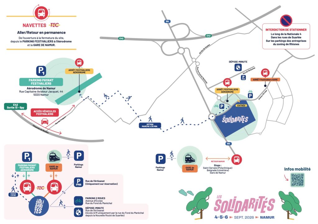 Les Solidarités ont prévu des navettes TEC gratuites depuis le parking des festivaliers (P 1) situé à l’Aérodrome de Namur et la gare de Namur (Quai B). Un plan général et les horaires sont disponibles sur la page Mobilité.